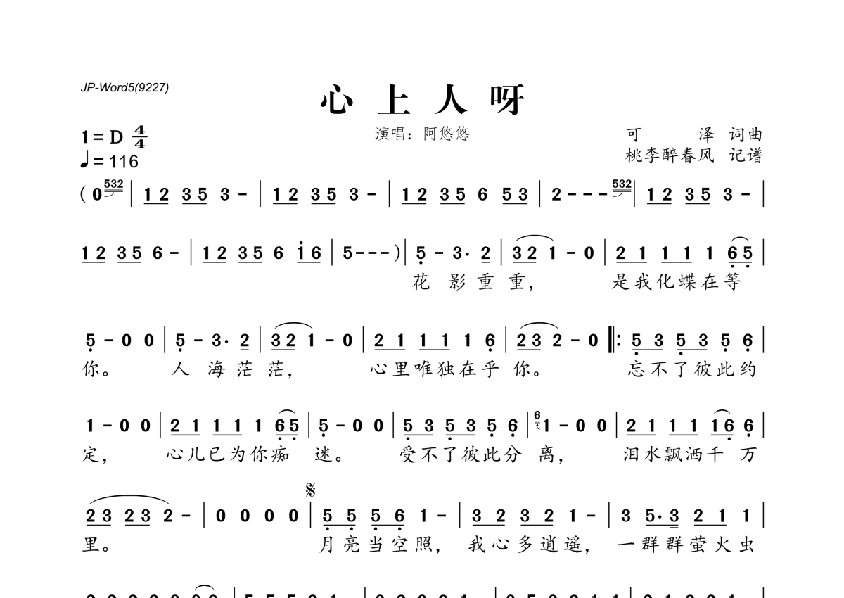 《心上人呀》是阿悠悠演唱的一首歌曲,拍号为4/4拍,歌曲速度为每分钟116拍,这份简谱共有一张高清图谱,图谱由 @桃李醉春风 编配上传。