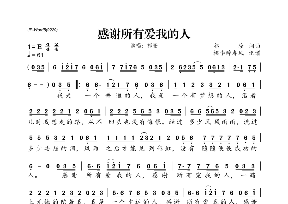 《感谢所有爱我的人》是祁隆演唱的一首歌曲,拍号为4/4拍,歌曲速度为每分钟61拍,这份简谱共有一张高清图谱,图谱由 @桃李醉春风 编配上传。
