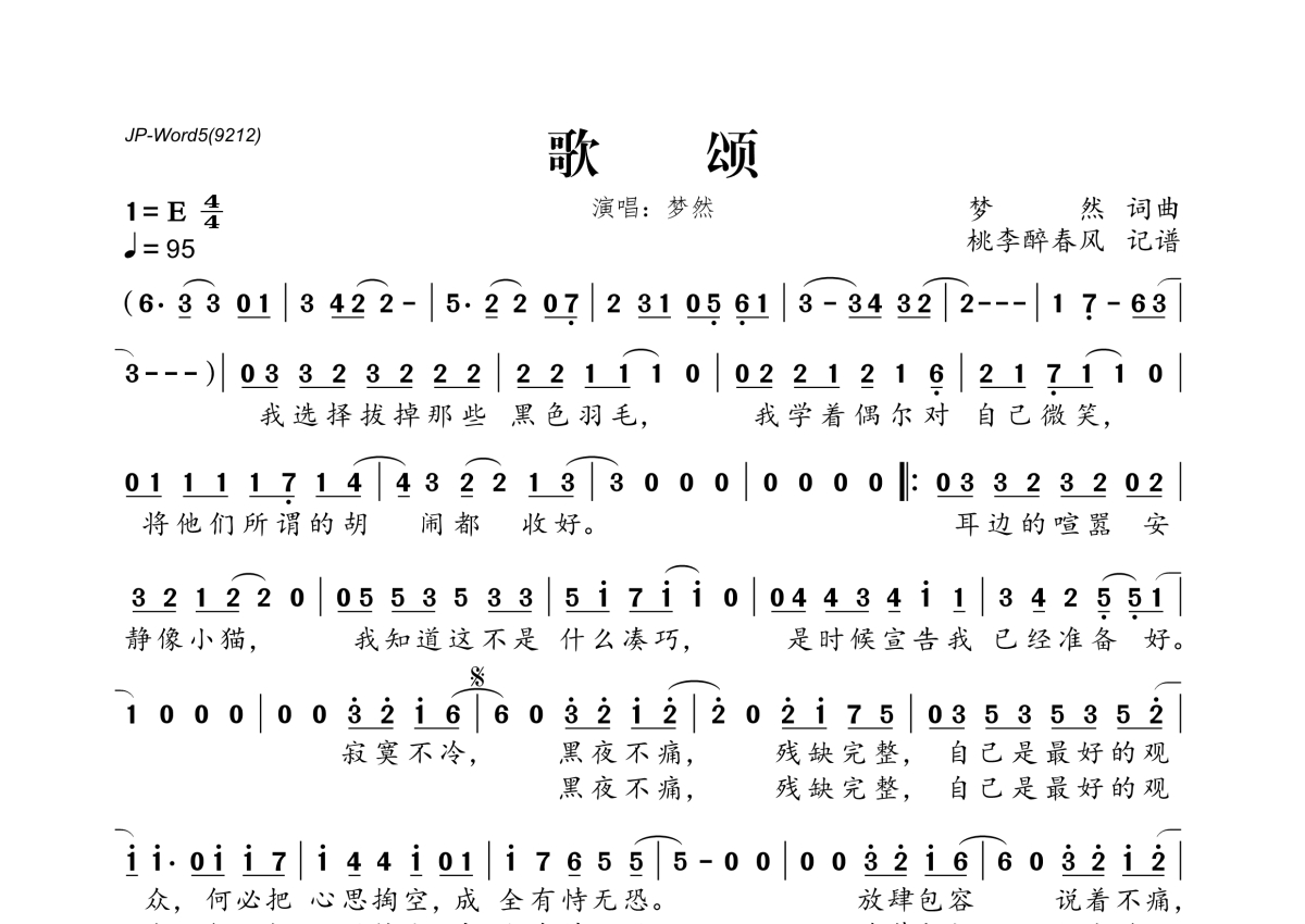 《歌颂》是梦然演唱的一首歌曲,拍号为4/4拍,歌曲速度为每分钟95拍,这份简谱共有一张高清图谱,图谱由 @桃李醉春风 编配上传。