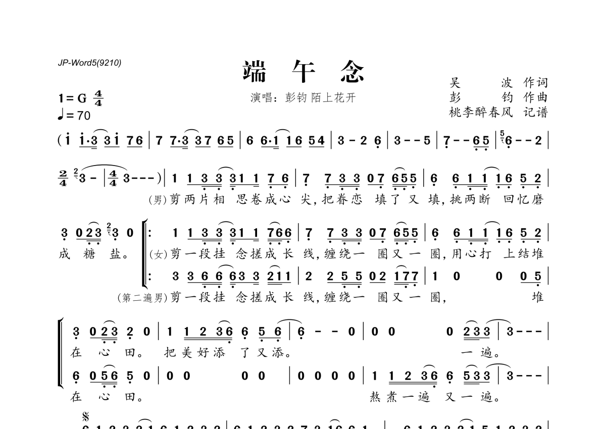 《端午念》是彭钧&陌上花开演唱的一首歌曲,拍号为4/4拍,歌曲速度为每分钟70拍,这份简谱共有一张高清图谱,图谱由 @桃李醉春风 编配上传。