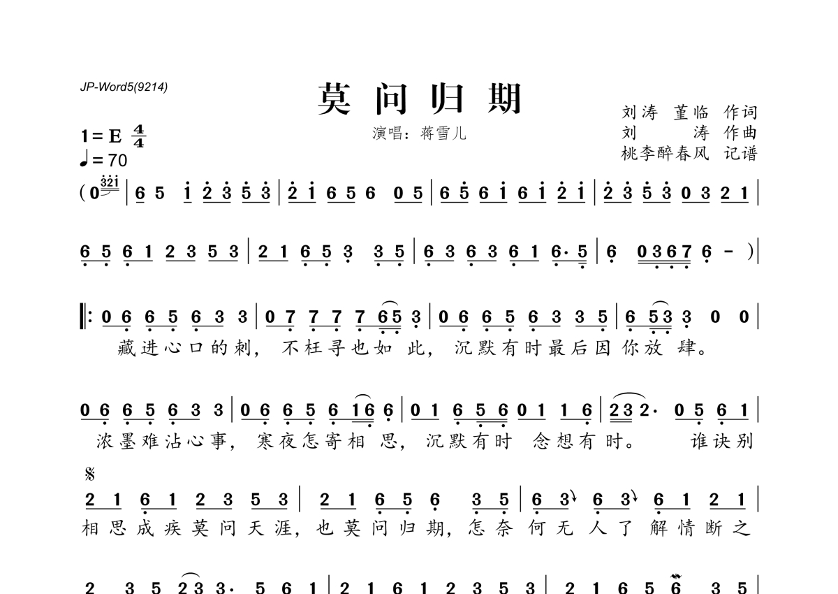 《莫问归期》是蒋雪儿演唱的一首歌曲,拍号为4/4拍,歌曲速度为每分钟70拍,这份简谱共有一张高清图谱,图谱由 @桃李醉春风 编配上传。