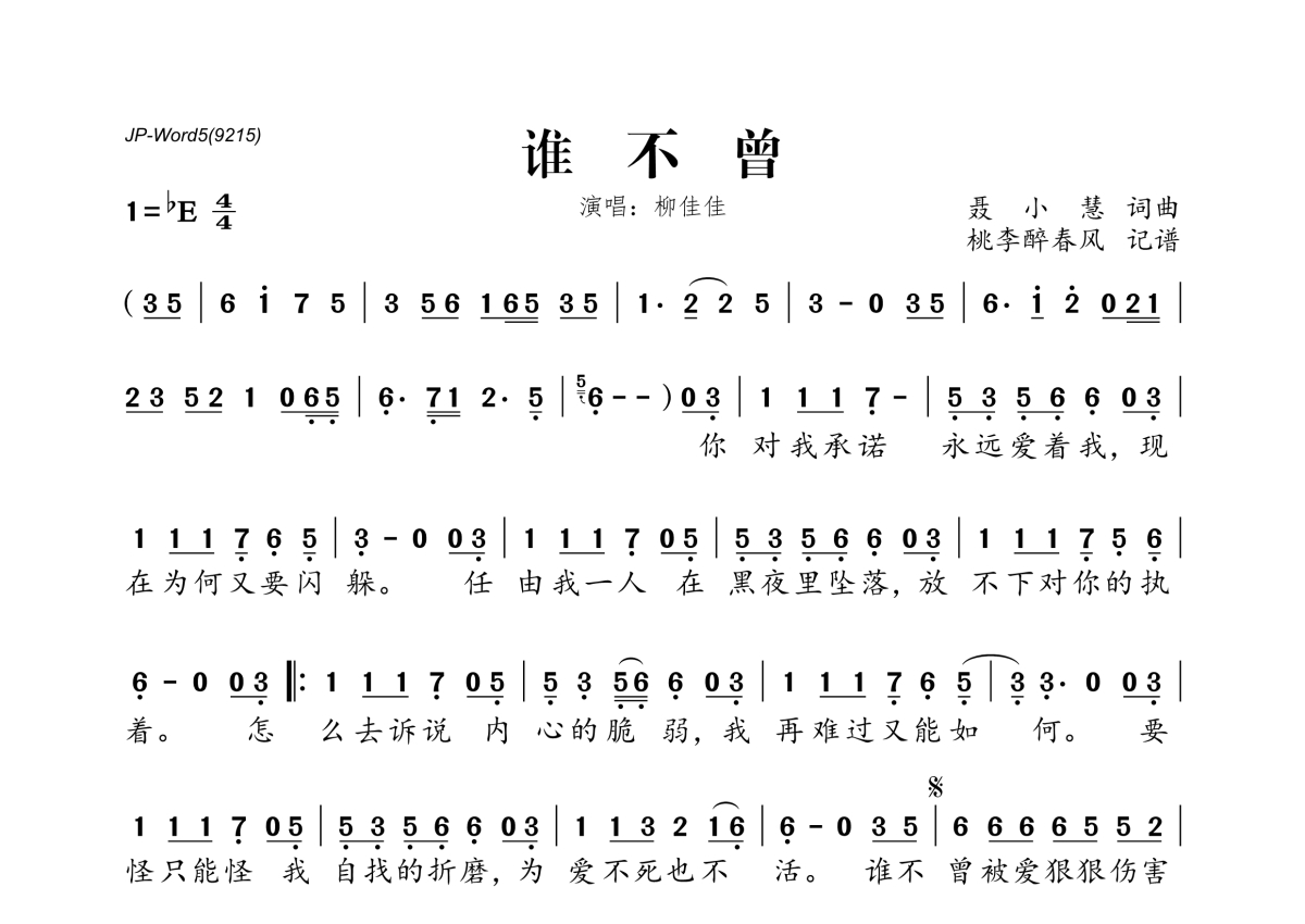 《谁不曾》是柳佳佳演唱的一首歌曲,拍号为4/4拍,这份简谱共有一张高清图谱,图谱由 @桃李醉春风 编配上传。