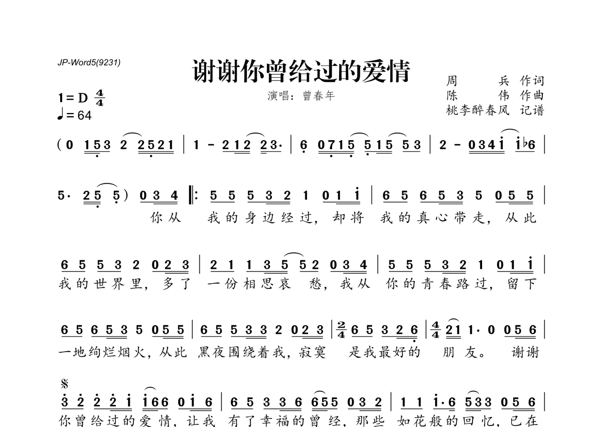曾春年《谢谢你曾给过的爱情》简谱