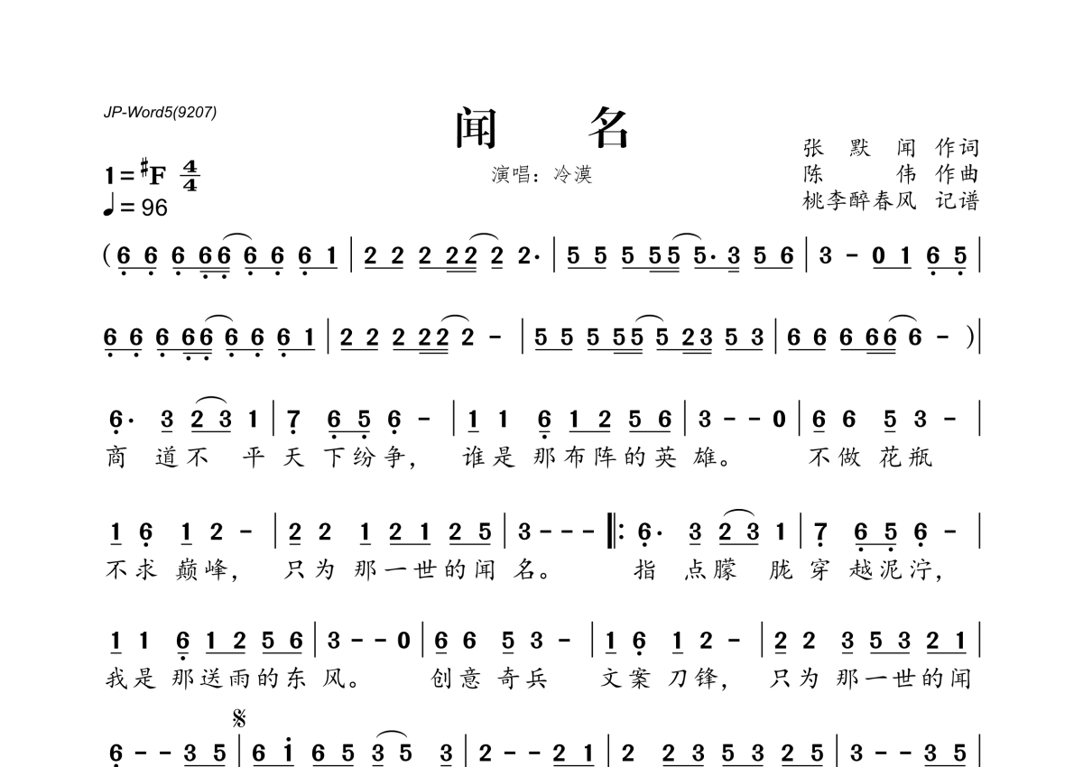 《闻名》是冷漠演唱的一首歌曲,拍号为4/4拍,歌曲速度为每分钟96拍,这份简谱共有一张高清图谱,图谱由 @桃李醉春风 编配上传。
