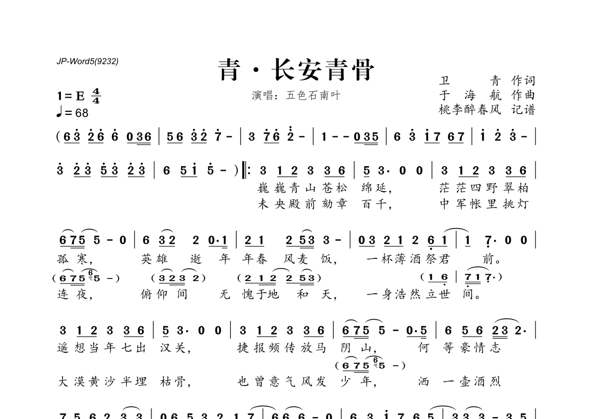 《青·长安青骨》是五色石南叶演唱的一首歌曲,拍号为4/4拍,歌曲速度为每分钟68拍,这份简谱共有一张高清图谱,图谱由 @桃李醉春风 编配上传。