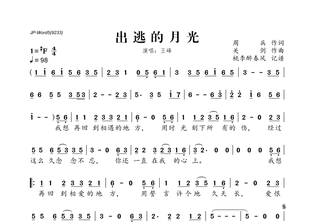 《出逃的月光》是王峰演唱的一首歌曲,拍号为4/4拍,歌曲速度为每分钟98拍,这份简谱共有一张高清图谱,图谱由 @桃李醉春风 编配上传。
