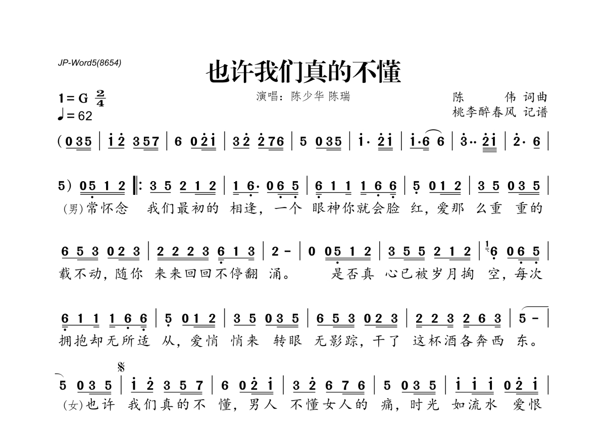 《也许我们真的不懂》是陈少华&陈瑞演唱的一首歌曲,拍号为2/4拍,歌曲速度为每分钟62拍,这份简谱共有一张高清图谱,图谱由 @桃李醉春风 编配上传。