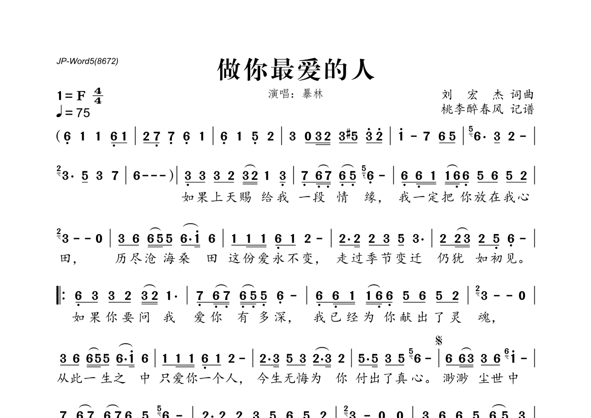 《做你最爱的人》是暴林演唱的一首歌曲,拍号为4/4拍,歌曲速度为每分钟75拍,这份简谱共有一张高清图谱,图谱由 @桃李醉春风 编配上传。