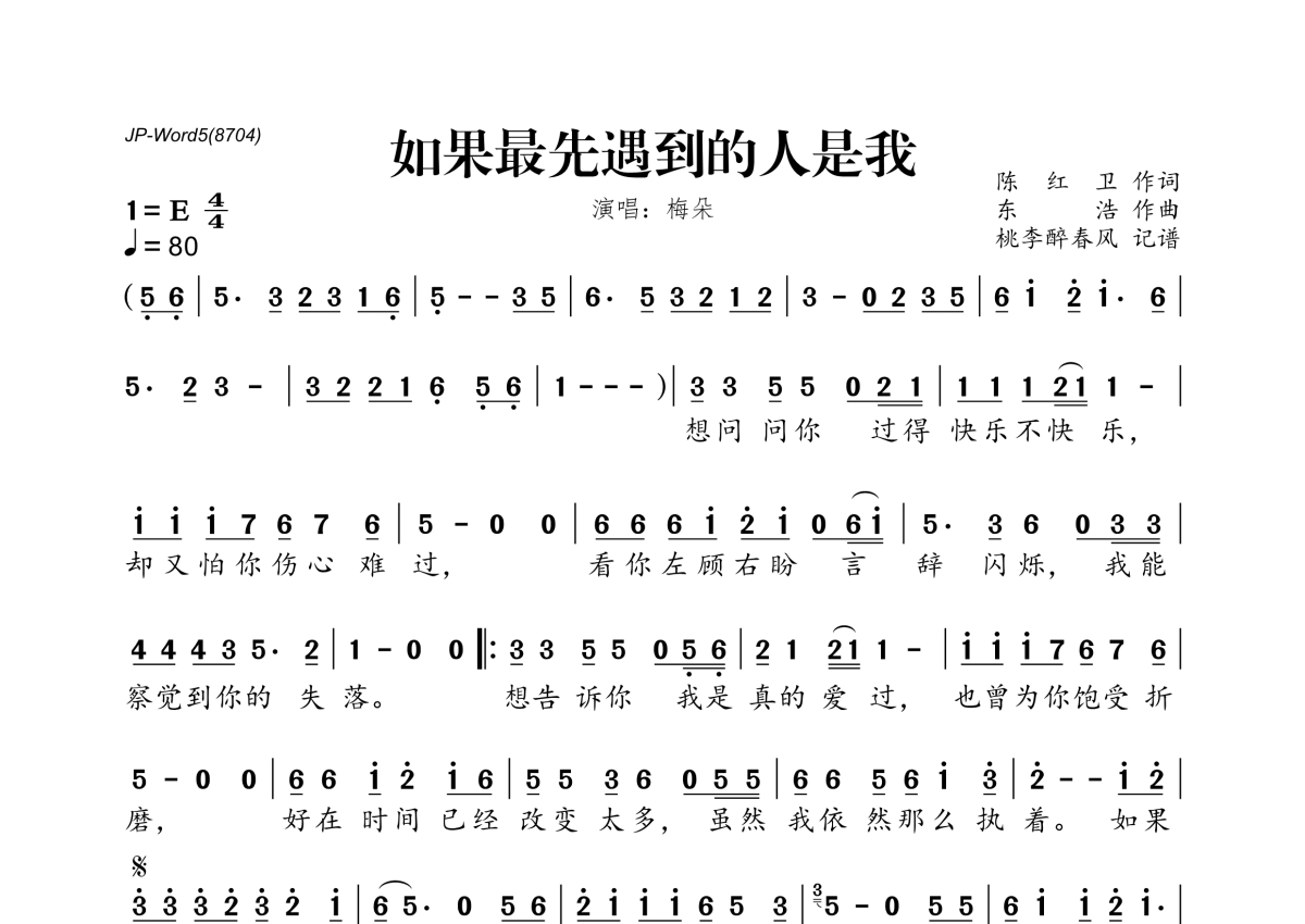 《如果最先遇到的人是我》是梅朵演唱的一首歌曲,拍号为4/4拍,歌曲速度为每分钟80拍,这份简谱共有一张高清图谱,图谱由 @桃李醉春风 编配上传。