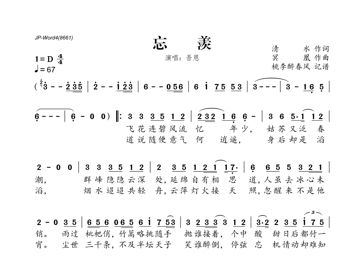 《忘羡》是吾恩演唱的一首歌曲,拍号为4/4拍,歌曲速度为每分钟67拍,这份简谱共有一张高清图谱,图谱由 @桃李醉春风 编配上传。