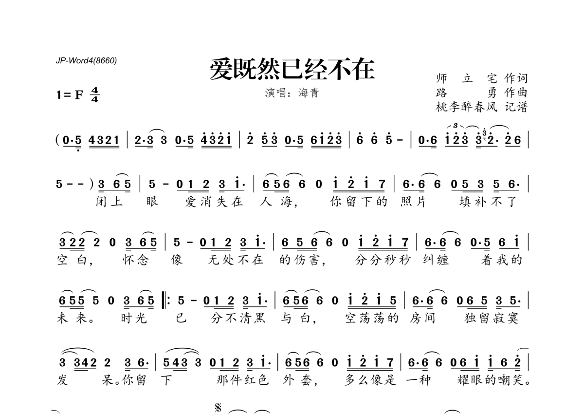 《爱既然已经不在》是海青演唱的一首歌曲,拍号为4/4拍,这份简谱共有一张高清图谱,图谱由 @桃李醉春风 编配上传。