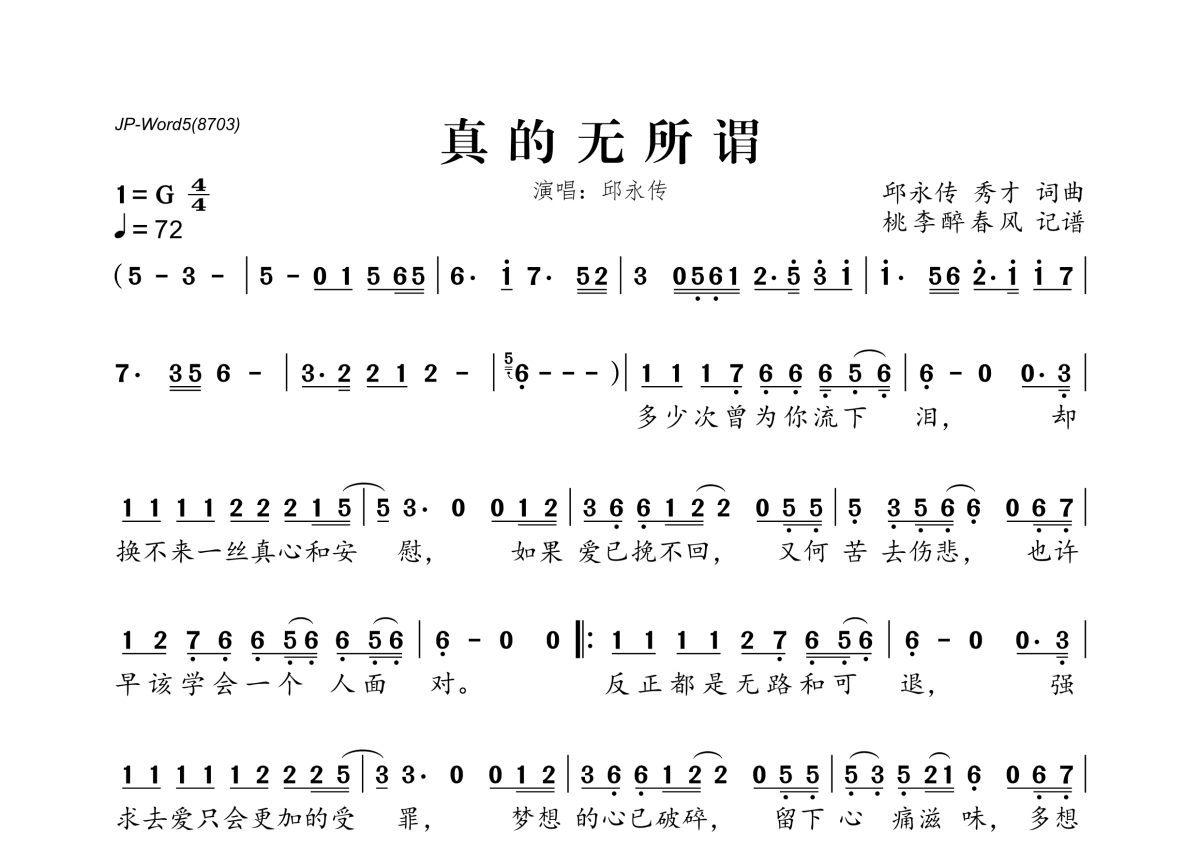《真的无所谓》是邱永传演唱的一首歌曲,拍号为4/4拍,歌曲速度为每分钟72拍,这份简谱共有一张高清图谱,图谱由 @桃李醉春风 编配上传。