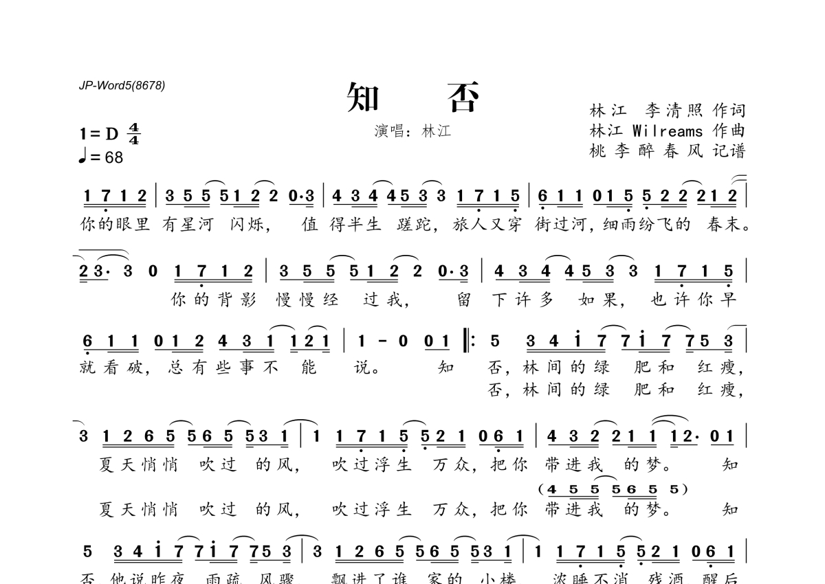 《知否》是林江演唱的一首歌曲,拍号为4/4拍,歌曲速度为每分钟68拍,这份简谱共有一张高清图谱,图谱由 @桃李醉春风 编配上传。