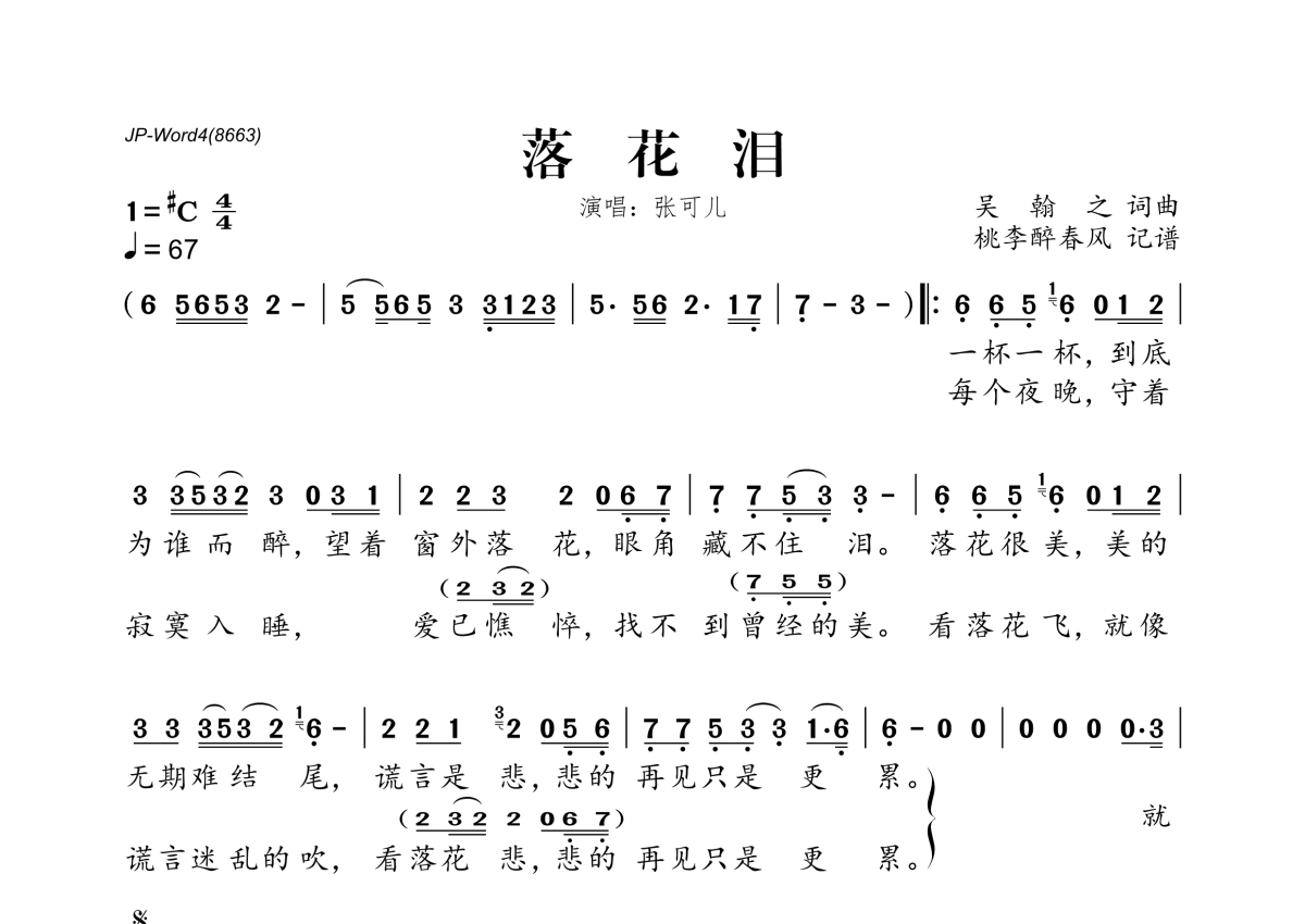 《落花泪》是张可儿演唱的一首歌曲,拍号为4/4拍,歌曲速度为每分钟67拍,这份简谱共有一张高清图谱,图谱由 @桃李醉春风 编配上传。