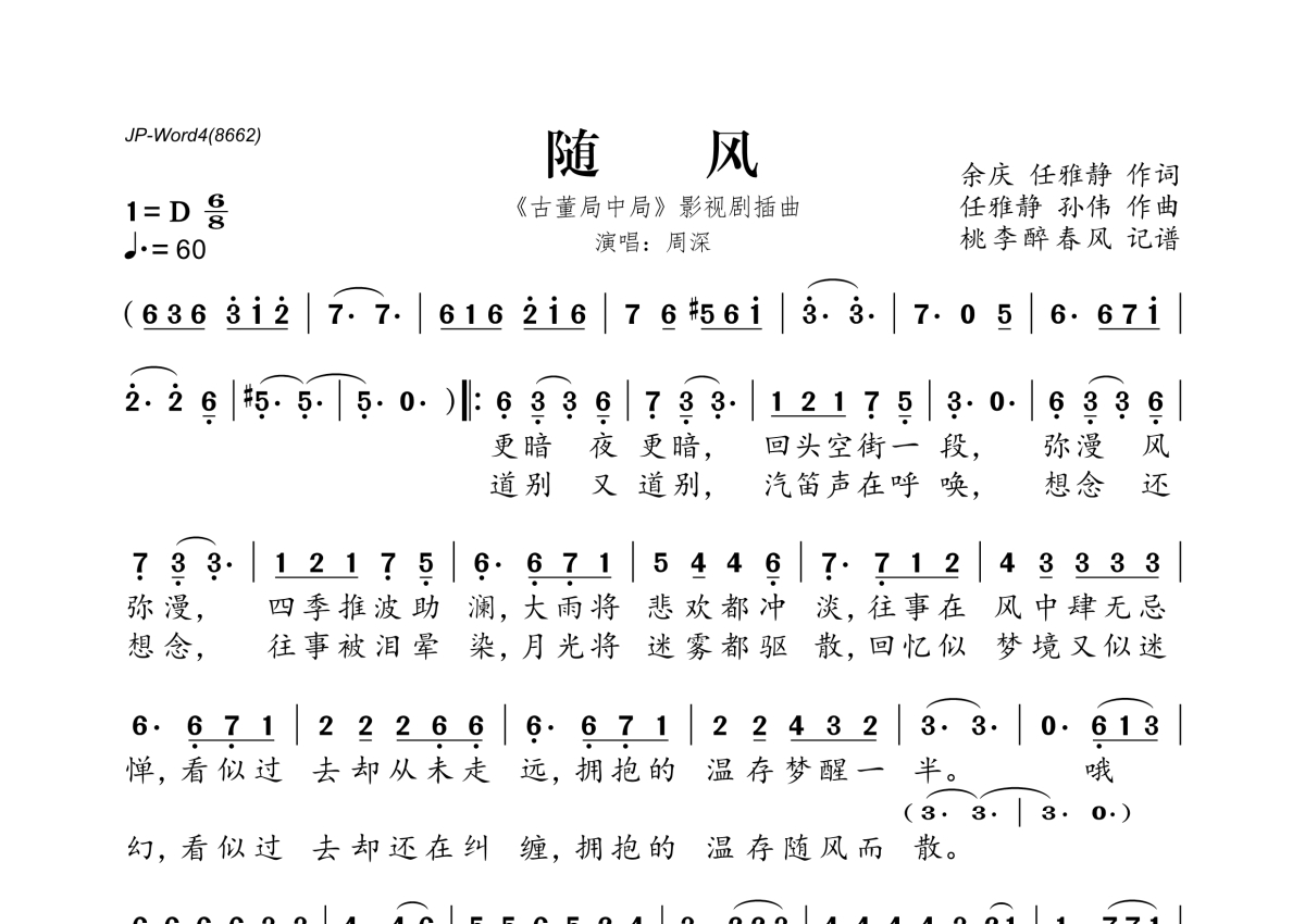 《随风》是周深演唱的一首歌曲,拍号为6/8拍,歌曲速度为每分钟60拍,这份简谱共有一张高清图谱,图谱由 @桃李醉春风 编配上传。