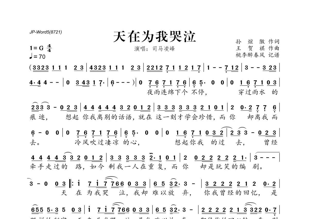 《天在为我哭泣》是司马凌峰演唱的一首歌曲,拍号为4/4拍,歌曲速度为每分钟70拍,这份简谱共有一张高清图谱,图谱由 @桃李醉春风 编配上传。