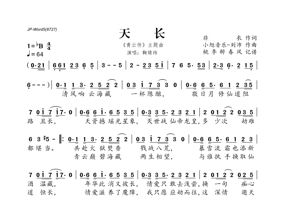 《天长》是鞠婧袆演唱的一首歌曲,拍号为4/4拍,歌曲速度为每分钟64拍,这份简谱共有一张高清图谱,图谱由 @桃李醉春风 编配上传。