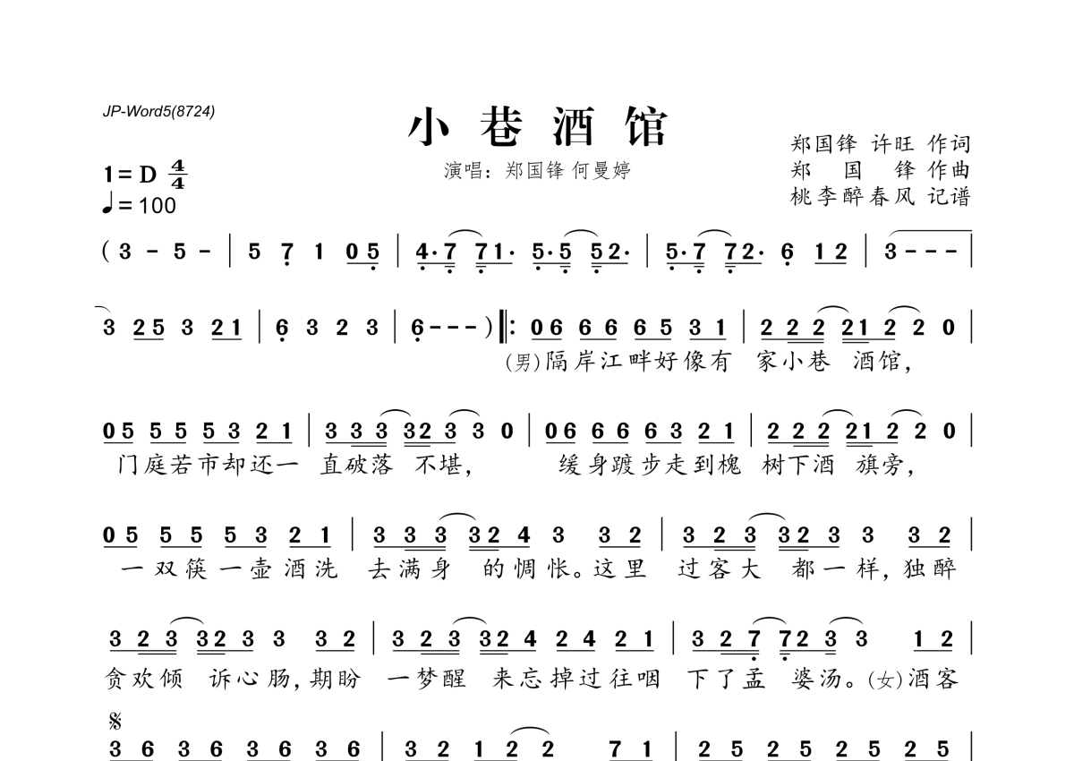 《小巷酒馆》是郑国锋&何曼婷演唱的一首歌曲,拍号为4/4拍,歌曲速度为每分钟100拍,这份简谱共有一张高清图谱,图谱由 @桃李醉春风 编配上传。