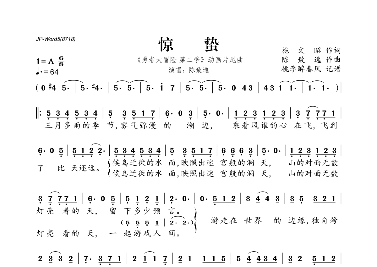 《惊蛰》是陈致逸演唱的一首歌曲,拍号为6/8拍,歌曲速度为每分钟64拍,这份简谱共有一张高清图谱,图谱由 @桃李醉春风 编配上传。