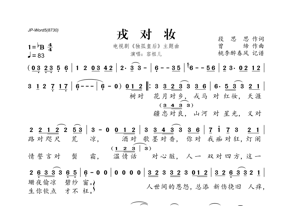 《戎对妆》是容祖儿演唱的一首歌曲,拍号为4/4拍,歌曲速度为每分钟83拍,这份简谱共有一张高清图谱,图谱由 @桃李醉春风 编配上传。