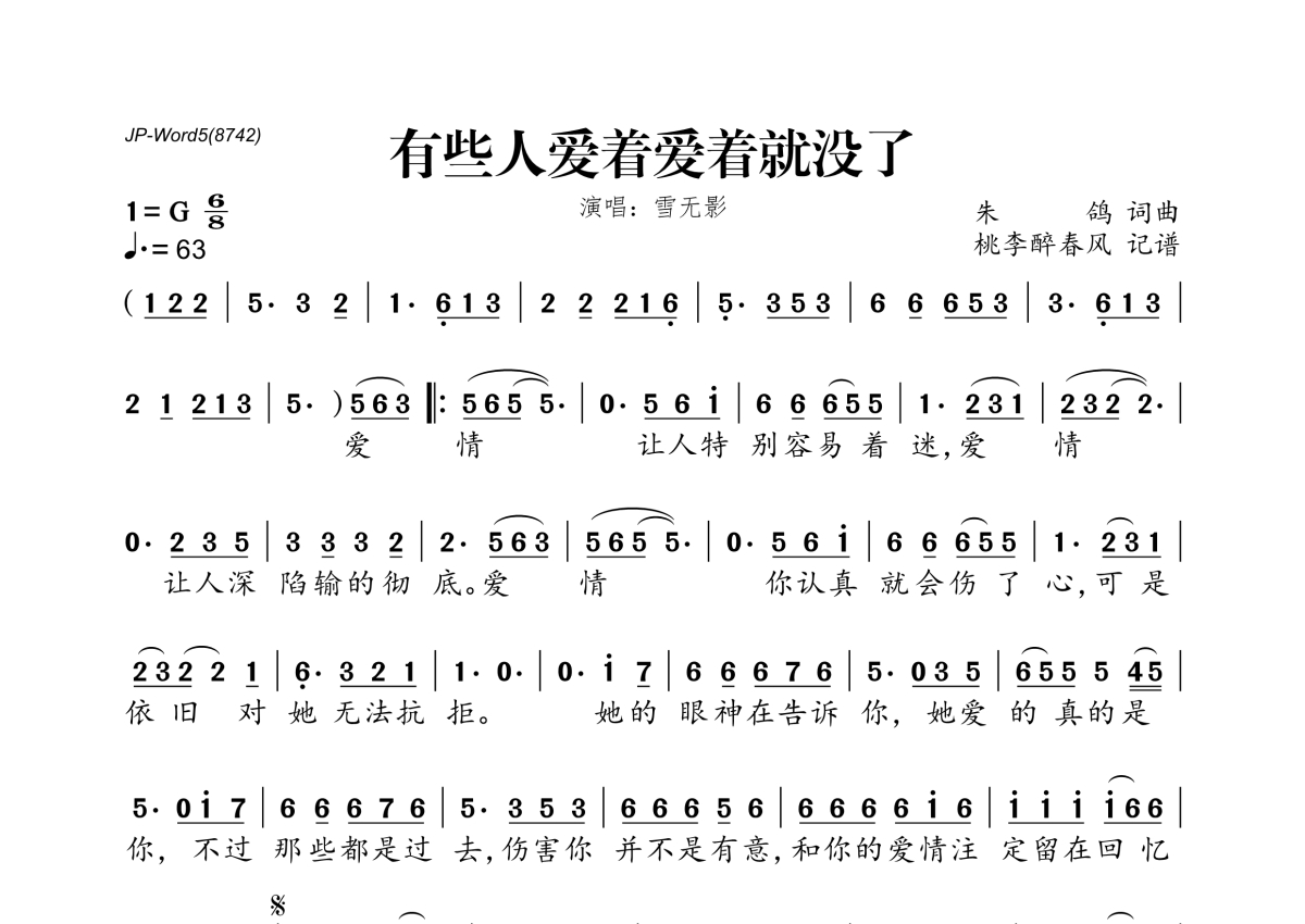 《有些人爱着爱着就没了》是雪无影演唱的一首歌曲,拍号为6/8拍,歌曲速度为每分钟63拍,这份简谱共有一张高清图谱,图谱由 @桃李醉春风 编配上传。
