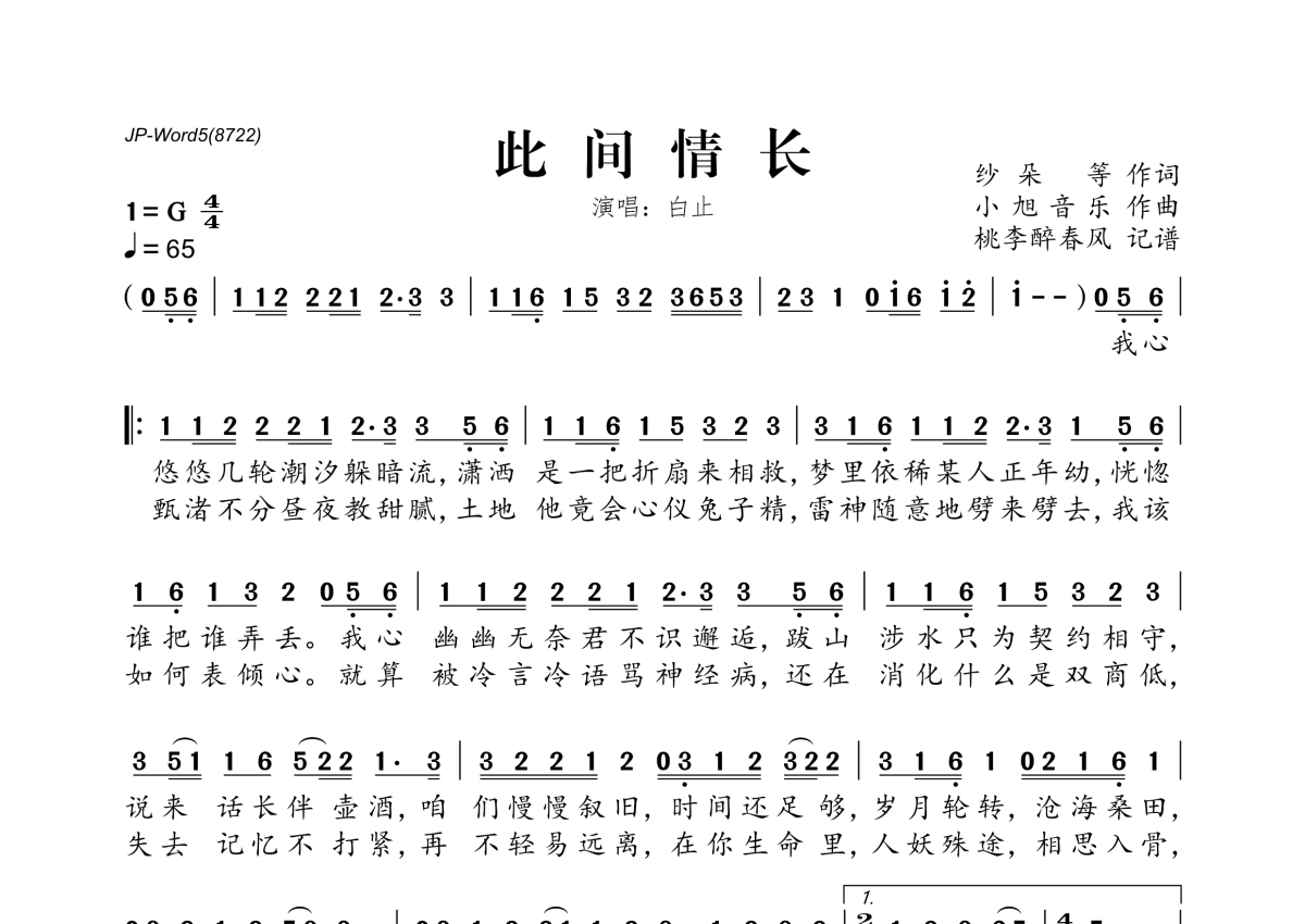 《此间情长》是白止演唱的一首歌曲,拍号为4/4拍,歌曲速度为每分钟65拍,这份简谱共有一张高清图谱,图谱由 @桃李醉春风 编配上传。