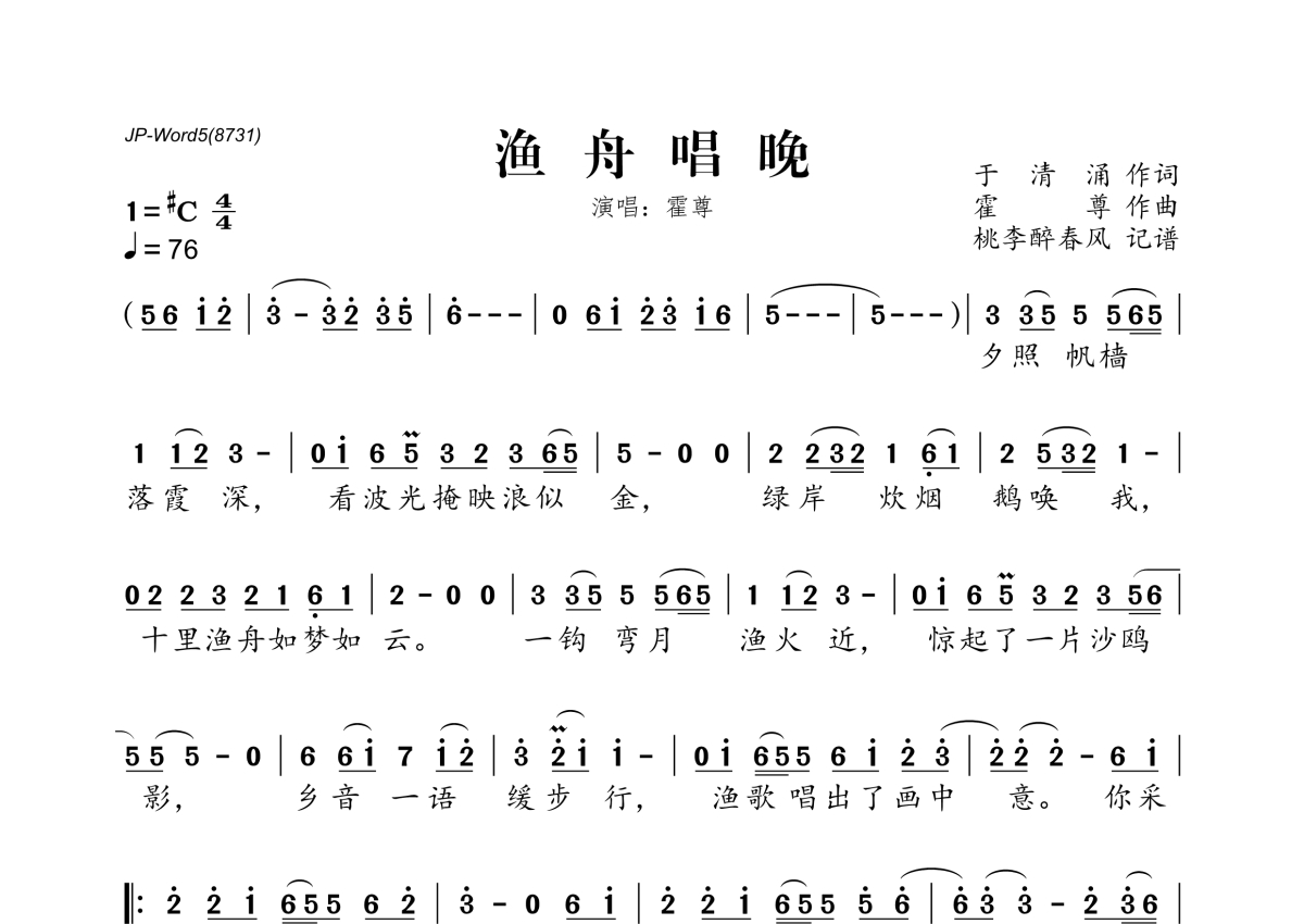 《渔舟唱晚》是霍尊演唱的一首歌曲,拍号为4/4拍,歌曲速度为每分钟76拍,这份简谱共有一张高清图谱,图谱由 @桃李醉春风 编配上传。
