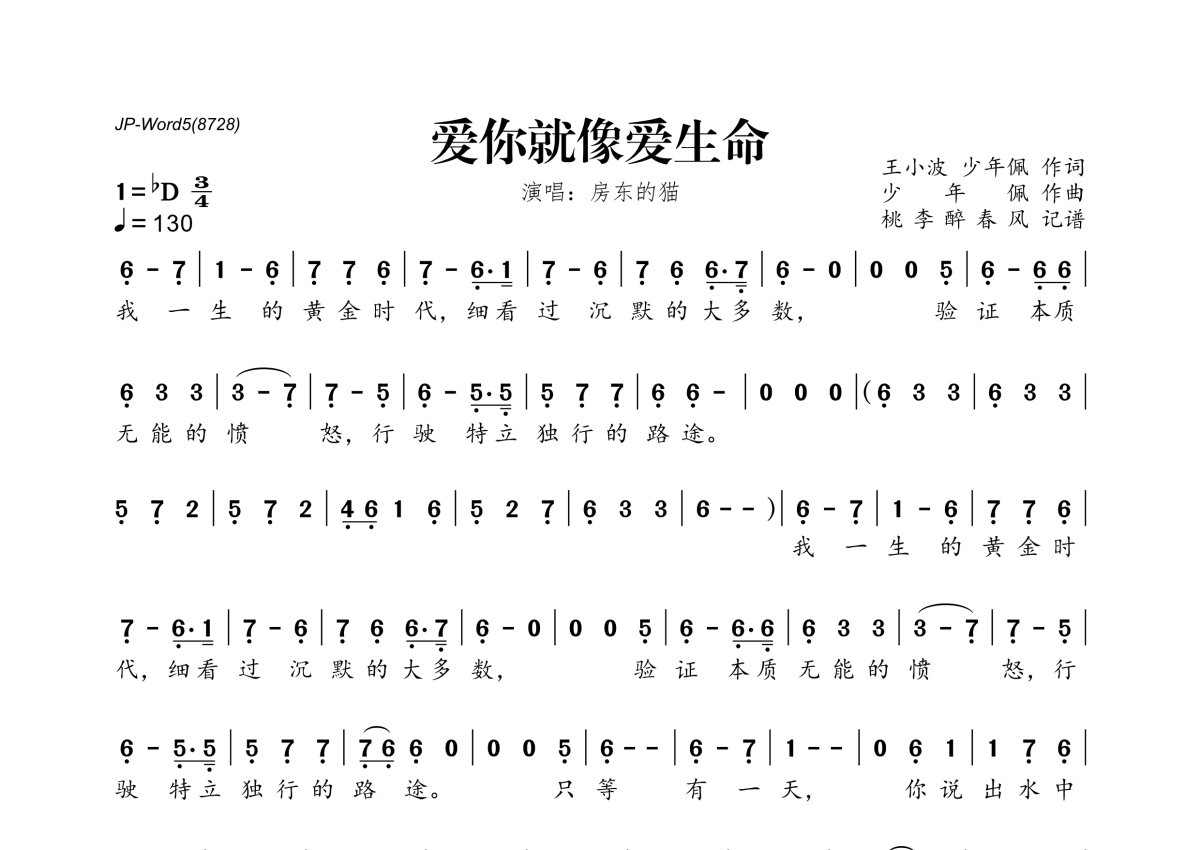 《爱你就像爱生命》是房东的猫演唱的一首歌曲,拍号为3/4拍,歌曲速度为每分钟130拍,这份简谱共有两张高清图谱,图谱由 @桃李醉春风 编配上传。