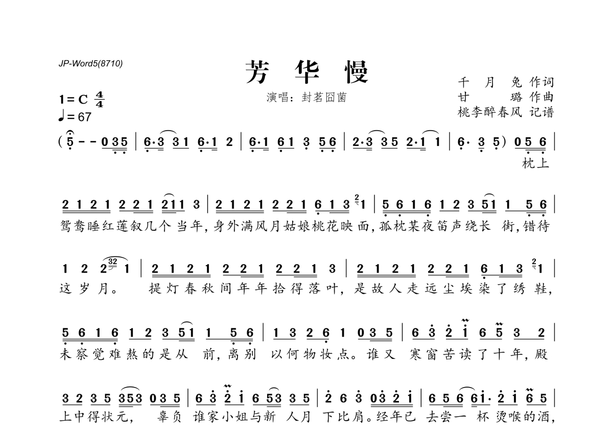 《芳华慢》是封茗囧菌演唱的一首歌曲,拍号为4/4拍,歌曲速度为每分钟67拍,这份简谱共有一张高清图谱,图谱由 @桃李醉春风 编配上传。