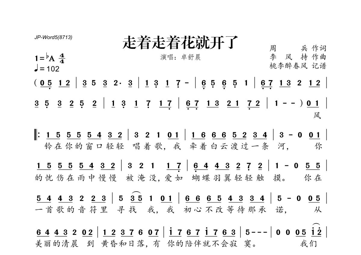 《走着走着花就开了》是卓舒晨演唱的一首歌曲,拍号为4/4拍,歌曲速度为每分钟102拍,这份简谱共有一张高清图谱,图谱由 @桃李醉春风 编配上传。