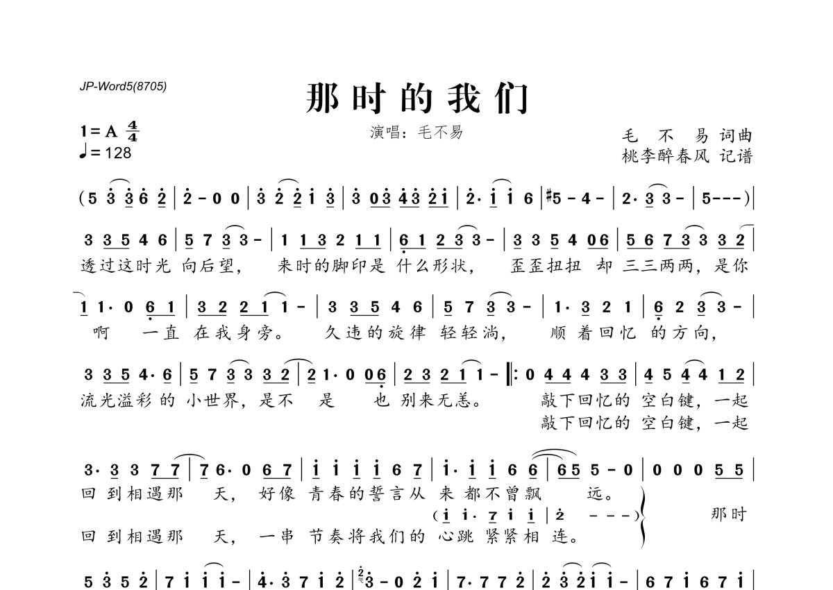 《那时的我们》是毛不易演唱的一首歌曲,拍号为4/4拍,歌曲速度为每分钟128拍,这份简谱共有一张高清图谱,图谱由 @桃李醉春风 编配上传。