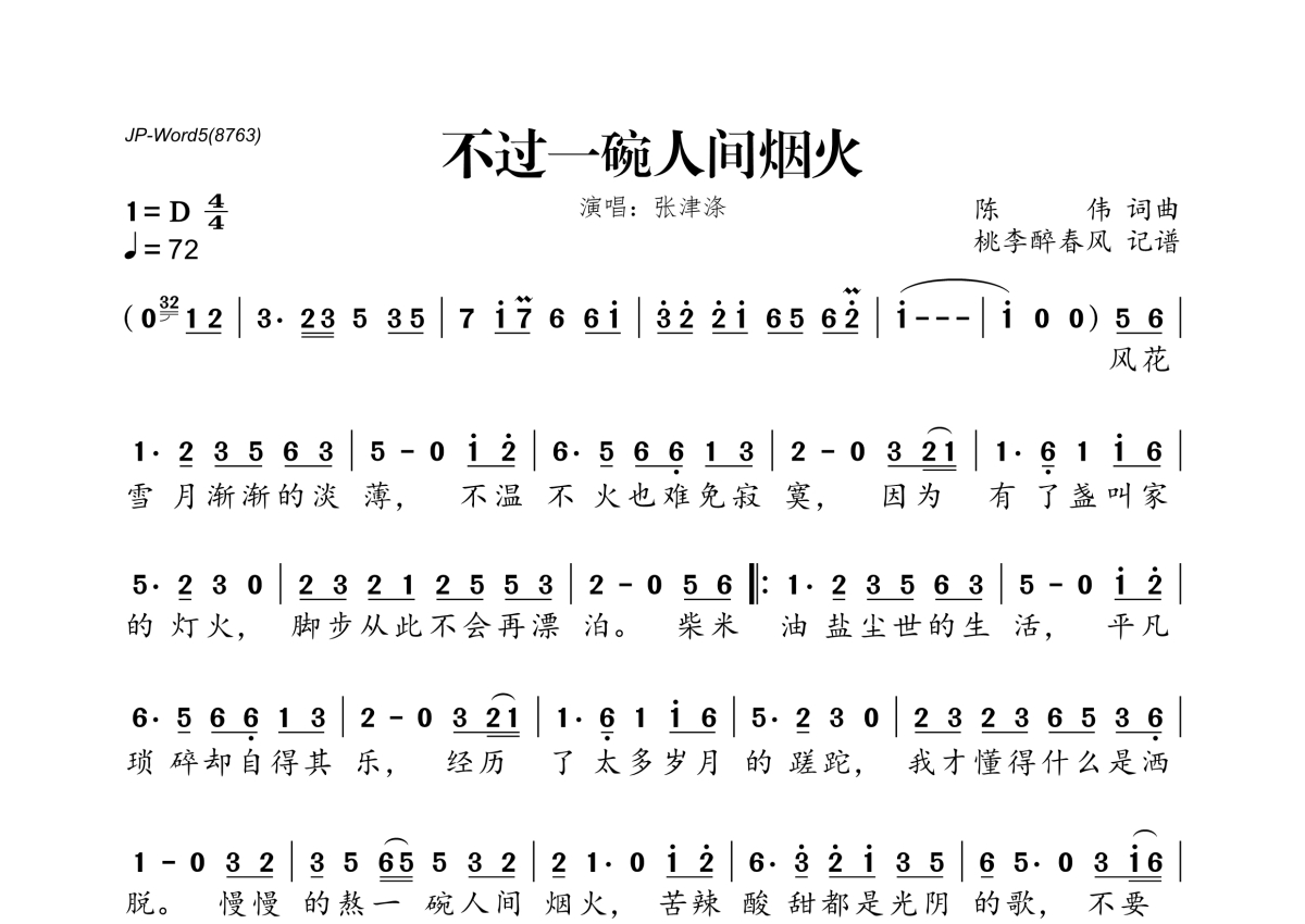 《不过一碗人间烟火》是张津涤演唱的一首歌曲,拍号为4/4拍,歌曲速度为每分钟72拍,这份简谱共有一张高清图谱,图谱由 @桃李醉春风 编配上传。
