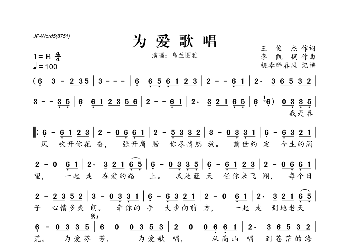 《为爱歌唱》是鸟兰图雅演唱的一首歌曲,拍号为4/4拍,歌曲速度为每分钟100拍,这份简谱共有一张高清图谱,图谱由 @桃李醉春风 编配上传。