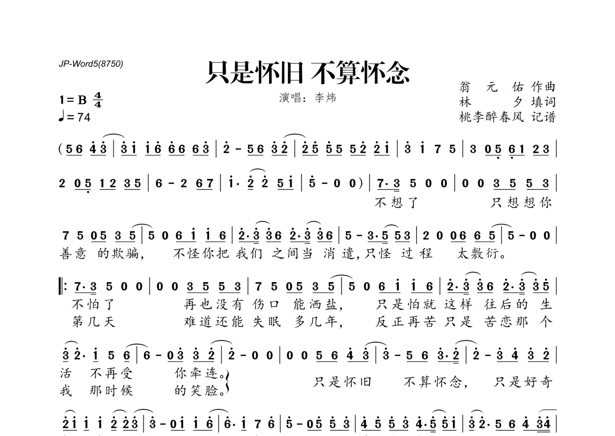 《只是怀旧 不算怀念》是李炜演唱的一首歌曲,拍号为4/4拍,歌曲速度为每分钟74拍,这份简谱共有一张高清图谱,图谱由 @桃李醉春风 编配上传。