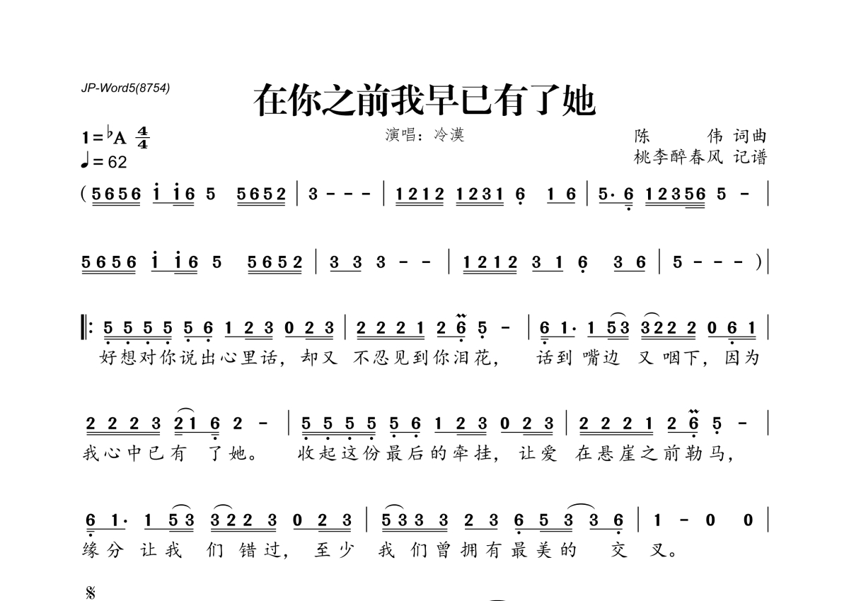 《在你之前我早已有了她》是冷漠演唱的一首歌曲,拍号为4/4拍,歌曲速度为每分钟62拍,这份简谱共有一张高清图谱,图谱由 @桃李醉春风 编配上传。