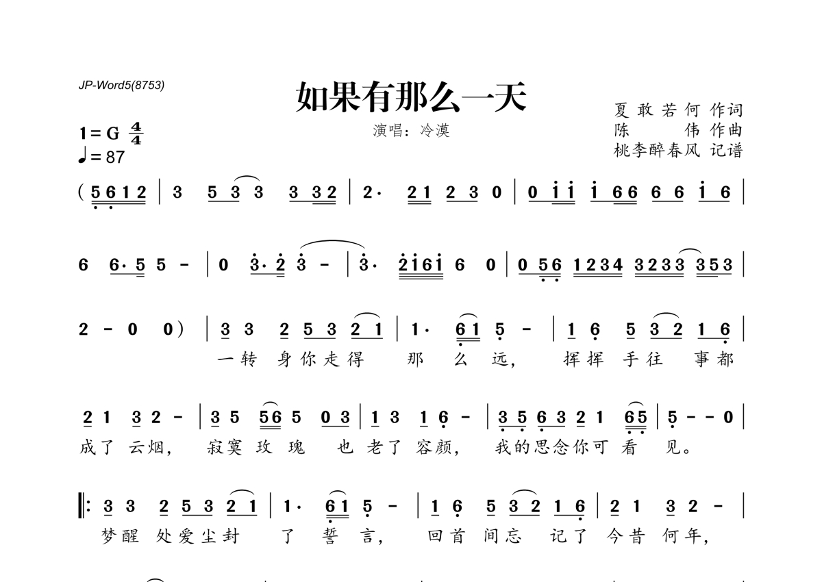 《如果有那么一天》是冷漠演唱的一首歌曲,拍号为4/4拍,歌曲速度为每分钟87拍,这份简谱共有一张高清图谱,图谱由 @桃李醉春风 编配上传。