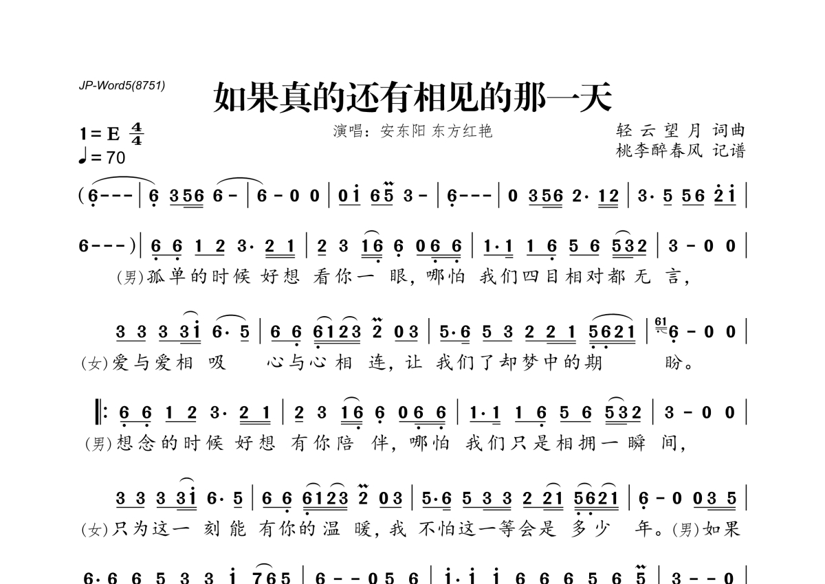 《如果真的还有相见的那一天》是安东阳&东方红艳演唱的一首歌曲,拍号为4/4拍,歌曲速度为每分钟70拍,这份简谱共有一张高清图谱,图谱由 @桃李醉春风 编配上传。