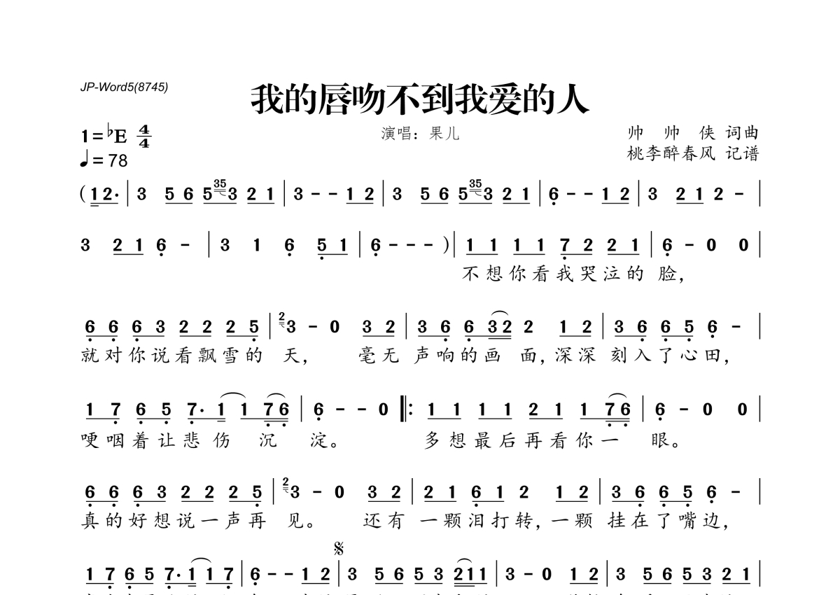 《我的唇吻不到我爱的人》是果儿演唱的一首歌曲,拍号为4/4拍,歌曲速度为每分钟78拍,这份简谱共有一张高清图谱,图谱由 @桃李醉春风 编配上传。