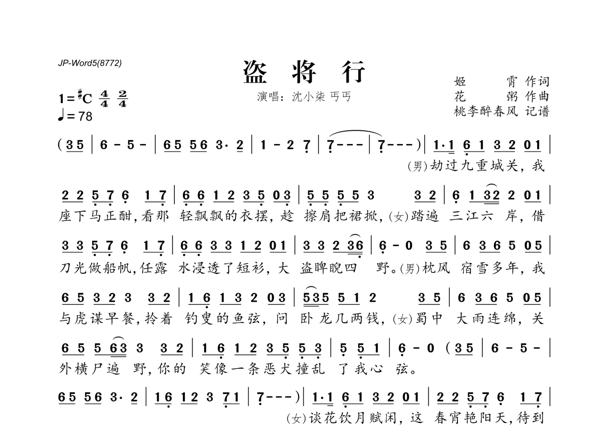 沈小柒&丐丐《盗将行》简谱
