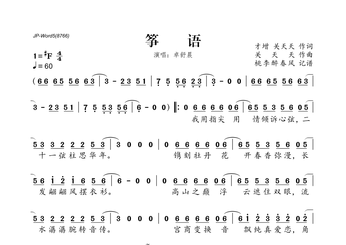 《筝语》是卓舒晨演唱的一首歌曲,拍号为4/4拍,歌曲速度为每分钟60拍,这份简谱共有一张高清图谱,图谱由 @桃李醉春风 编配上传。