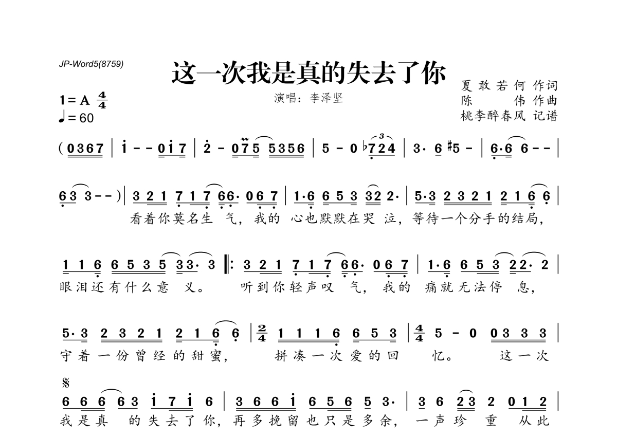 《这一次我是真的失去了你》是李泽坚演唱的一首歌曲,拍号为4/4拍,歌曲速度为每分钟60拍,这份简谱共有一张高清图谱,图谱由 @桃李醉春风 编配上传。