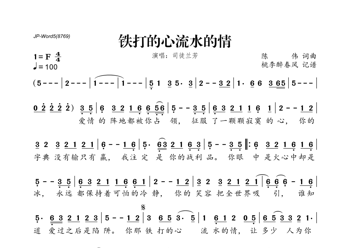 《铁打的心流水的情》是司徒兰芳演唱的一首歌曲,拍号为4/4拍,歌曲速度为每分钟100拍,这份简谱共有一张高清图谱,图谱由 @桃李醉春风 编配上传。