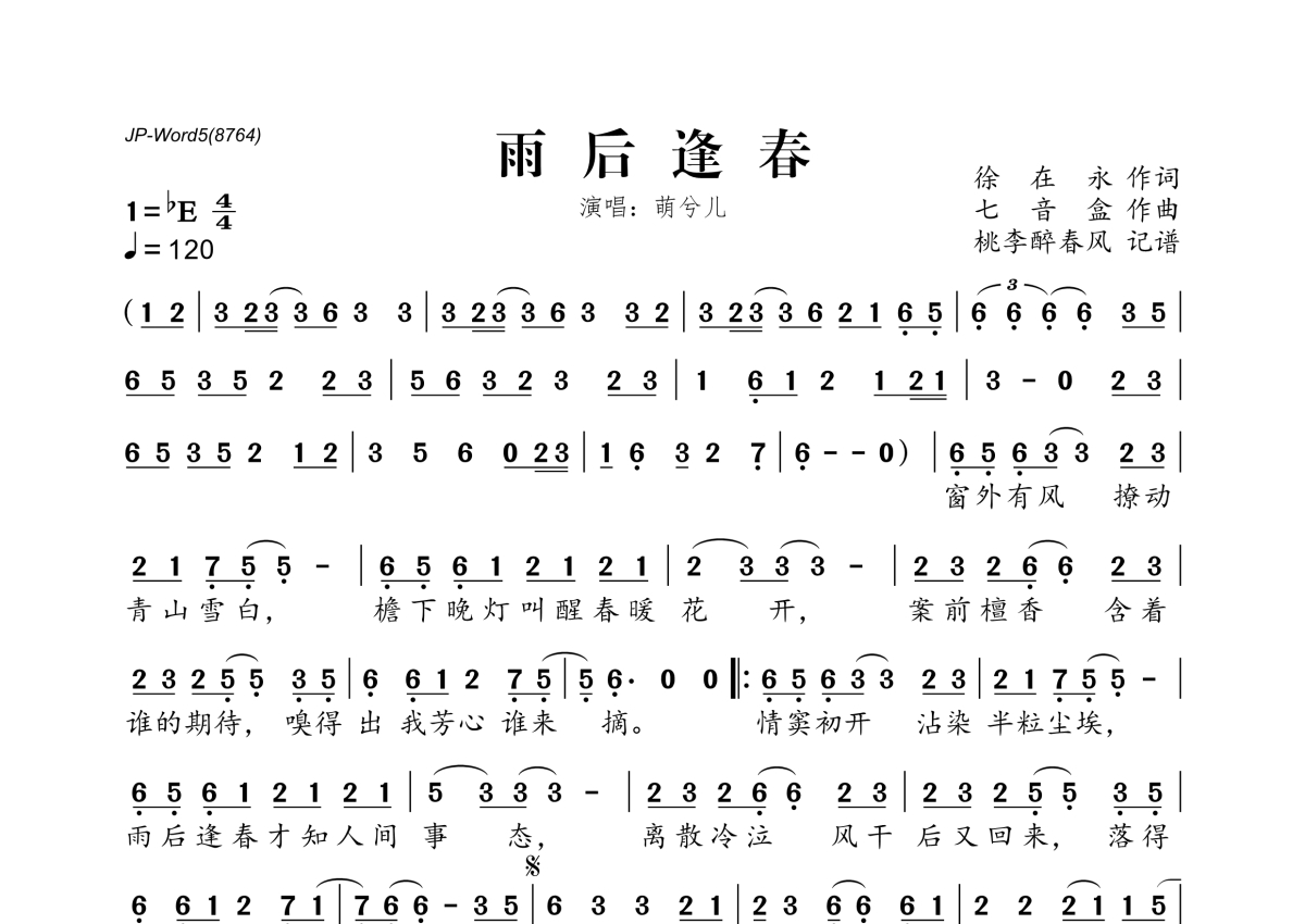 《雨后逢春》是萌兮儿演唱的一首歌曲,拍号为4/4拍,歌曲速度为每分钟120拍,这份简谱共有一张高清图谱,图谱由 @桃李醉春风 编配上传。