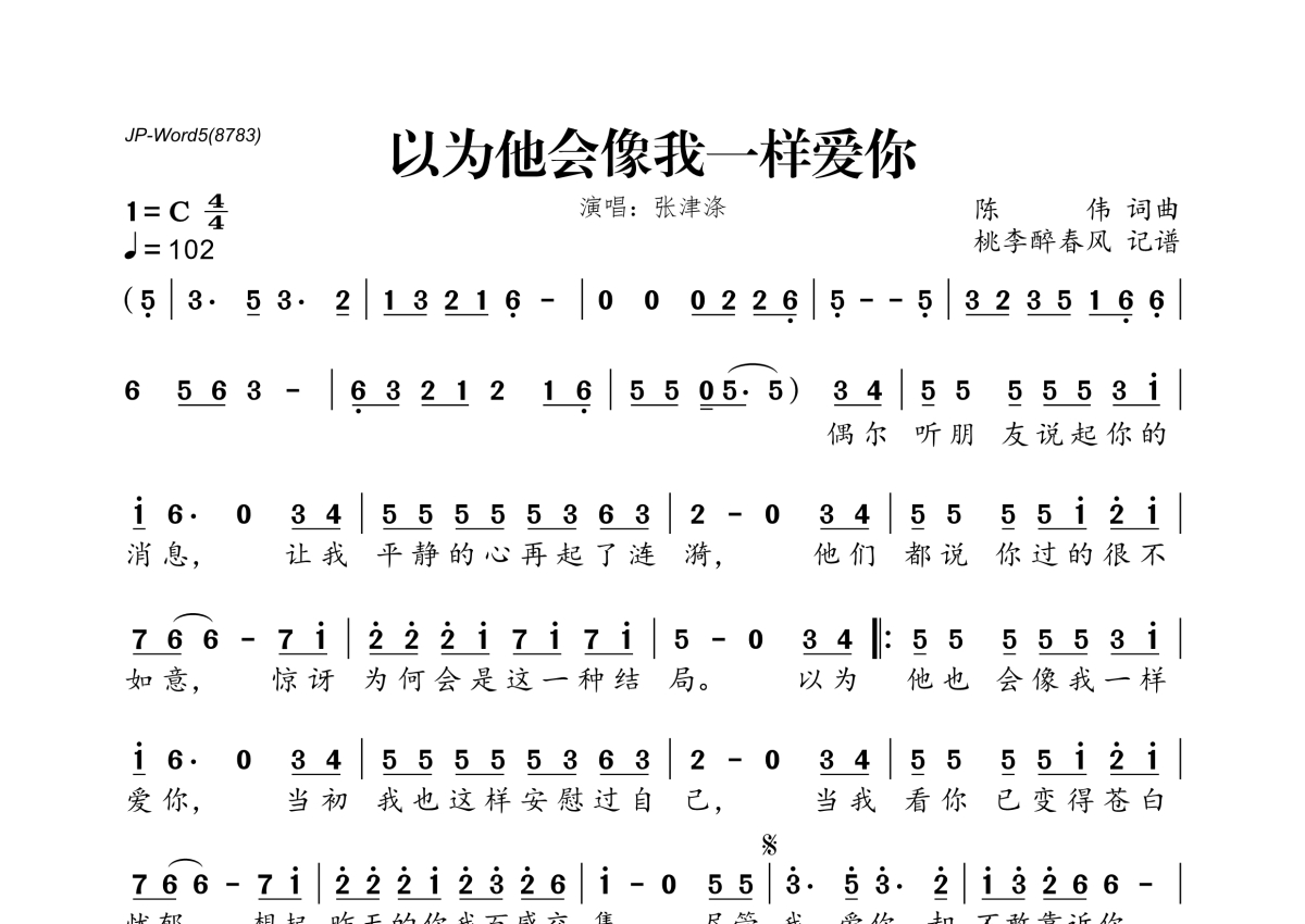 《以为他会像我一样爱你》是张津涤演唱的一首歌曲,拍号为4/4拍,歌曲速度为每分钟102拍,这份简谱共有一张高清图谱,图谱由 @桃李醉春风 编配上传。