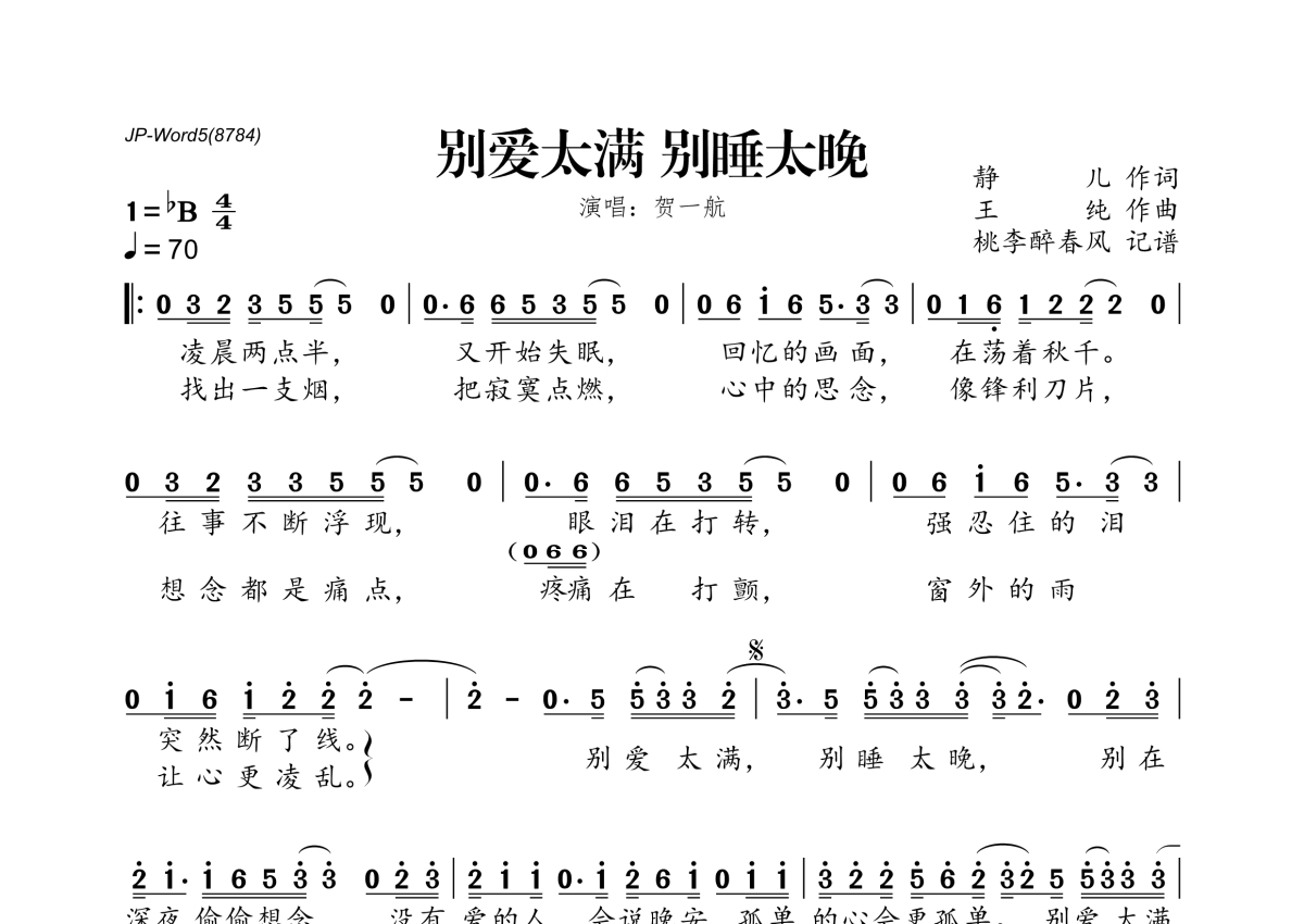 《别爱太满 别睡太晚》是贺一航演唱的一首歌曲,拍号为4/4拍,歌曲速度为每分钟70拍,这份简谱共有一张高清图谱,图谱由 @桃李醉春风 编配上传。