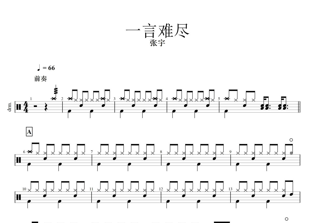 《一言难尽》是张宇演唱的一首歌曲,这份鼓谱共有两张高清图谱,图谱由 @打鼓谱 编配上传,图谱使用五线谱编配,使用这份一言难尽架子鼓谱,你将能够轻松地敲打出这首张宇的一言难尽,快来尝试吧。《一言难尽》是张宇演唱的一首歌曲,由十一郎作词,张宇作曲,涂惠源编曲,收录在张宇1995年6月9日发行的同名专辑《一言难尽》中。该曲是电视剧《地下猎人》的主题曲。