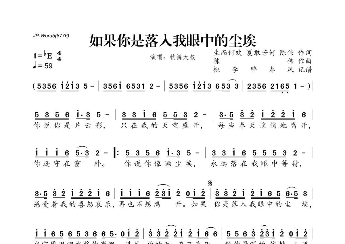 《如果你是落入我眼中的尘埃》是秋裤大叔演唱的一首歌曲,拍号为4/4拍,歌曲速度为每分钟59拍,这份简谱共有一张高清图谱,图谱由 @桃李醉春风 编配上传。
