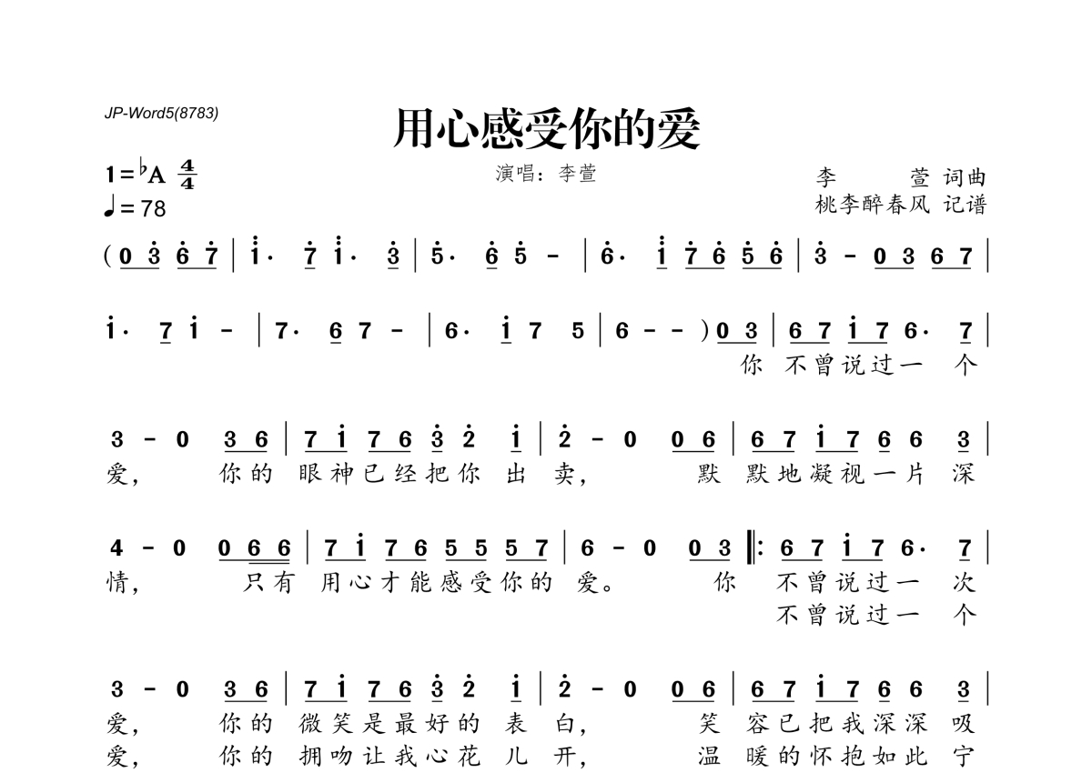 《用心感受你的爱》是李萱演唱的一首歌曲,拍号为4/4拍,歌曲速度为每分钟78拍,这份简谱共有一张高清图谱,图谱由 @桃李醉春风 编配上传。