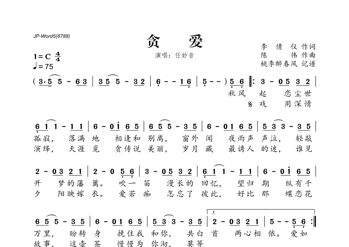 《贪爱》是任妙音演唱的一首歌曲,拍号为4/4拍,歌曲速度为每分钟75拍,这份简谱共有一张高清图谱,图谱由 @桃李醉春风 编配上传。