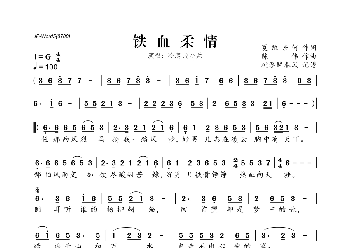 《铁血柔情》是冷漠&赵小兵演唱的一首歌曲,拍号为4/4拍,歌曲速度为每分钟100拍,这份简谱共有一张高清图谱,图谱由 @桃李醉春风 编配上传。